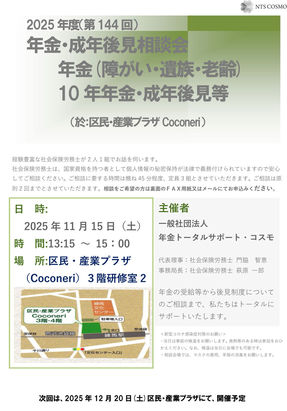 相談会に申込まれる場合は、①案内裏面に記入いただきFAXによる申込み ②案内裏面に記載してありますメールアドレス mail: http://www.ntscosmo.com/ による申し込み および ③ 本HPの問い合わせよる申込み のいずれかでお願いいたします。
